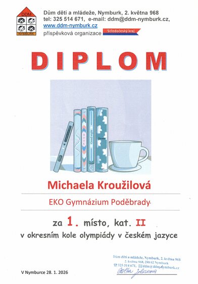 Gratulujeme Michaele Kroužilové ze 7.V k získání 1. místa v okresním kole olympiády v českém jazyce a postupu do krajského kola.